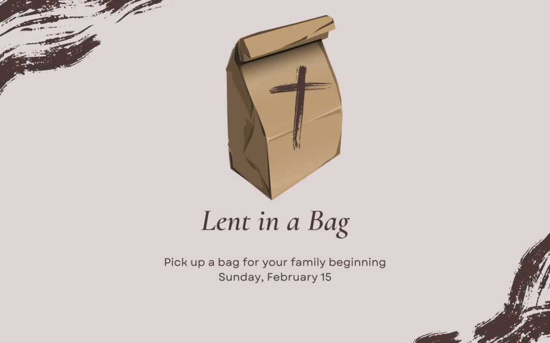 Beginning Sunday, February 15, each household may pick up a Lent in a Bag kit at the church. Lent is the 40 days before Easter where we seek to journey with Jesus. Lent in a Bag provides us with symbols, scripture and reflective questions for a weekly devotional in our homes. We are inviting all our households to join in this Lenten journey.